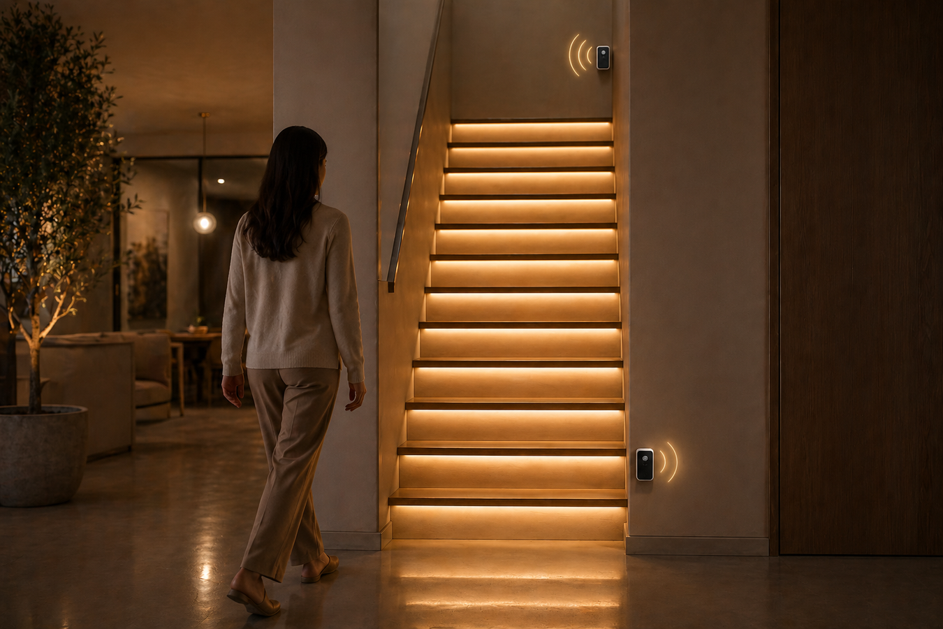 「Motion-Activated Stair Lighting」Lights automatically turn on in sequence as you step onto the staircase and gradually switch off when you leave, ...